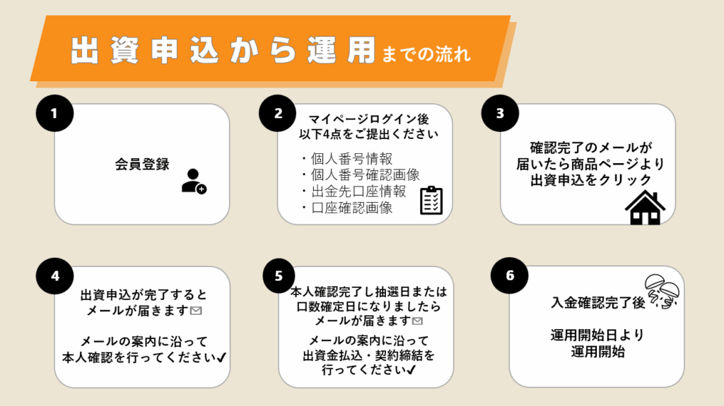 ⑦本人確認が完了し抽選日または口数確定日になりましたら、当選または口数確定のメールが届きます。メールの案内に沿って出資金払込・契約締結を行ってください。