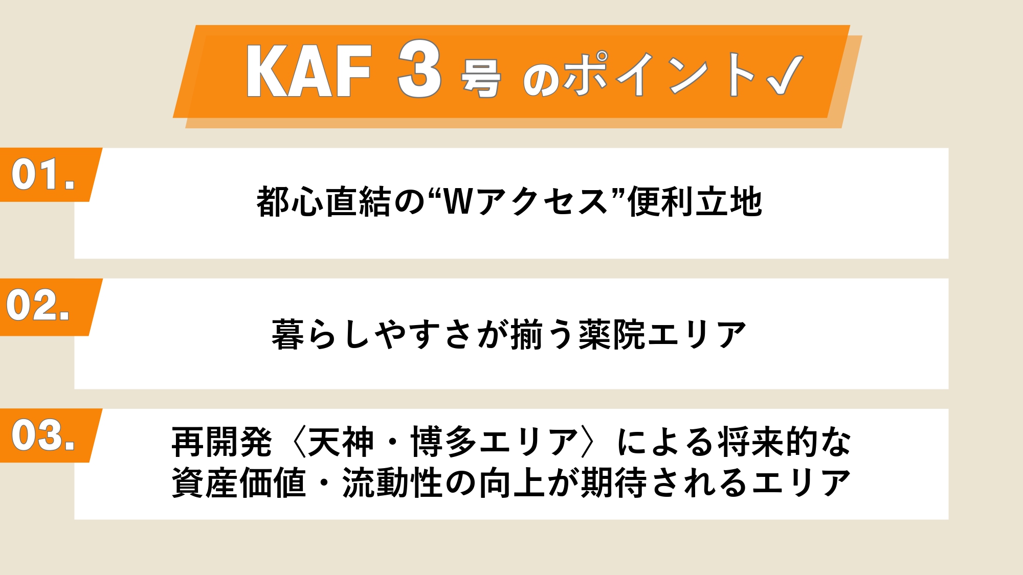- KAF3号【福岡市・薬院】(ティアラ薬院)は福岡市中央区薬院エリアにある区分マンションを投資対象としています。